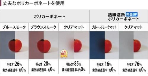 屋根材は、ポリカーボネート(3色)もしくは熱線遮断ポリカーボネート(2色)からお選びいただけます