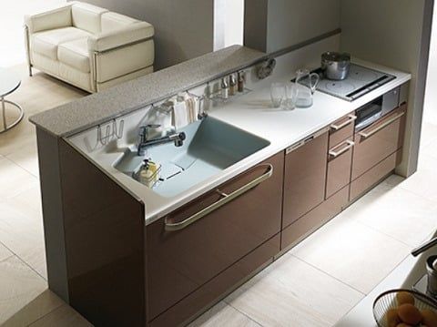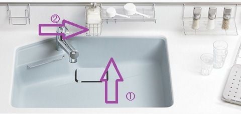 一般的に?のところに洗剤置き場がある場合が多いですがこのキッチンは?のところに