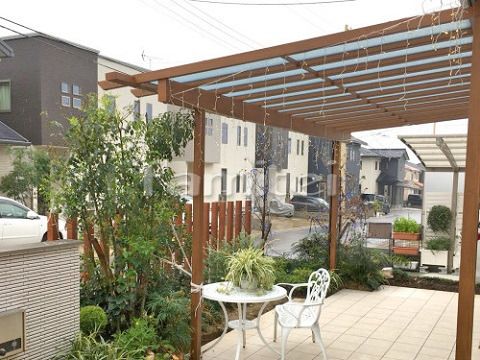 こちらはタイルデッキの上にYKKAPのサザンテラスのパーゴラタイプを設置しています
