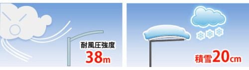 最大38m/秒の耐風圧、積雪20cmまでの強度がありますので、突然変わる天候に強く安心です。