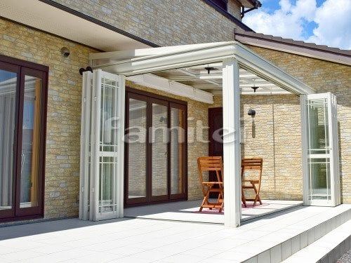 広々とした白のタイルデッキに、アイボリーホワイトのガーデンルームが