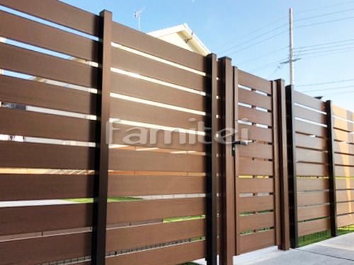 フェンスは樹脂製の木目調の目隠しフェンスです。