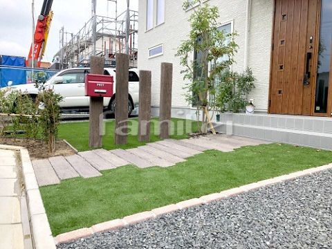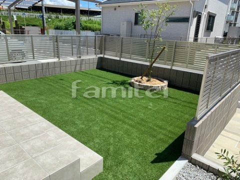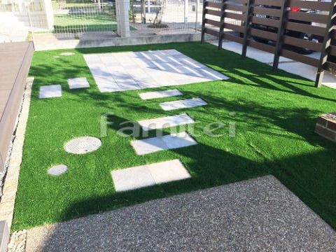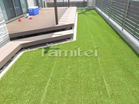 こちらのようにウッドデッキのまわりに敷けば家族みんなで楽しめるお庭になりますね