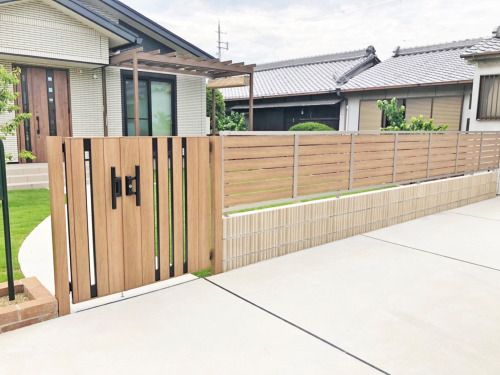 木目調のフェンスと門扉が外構を明るい雰囲気にしています