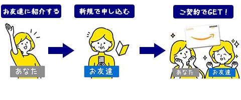 対象期間に受付分でご契約になると、ご紹介した方にAmazonギフトコード5,000円分、ご紹介された方へAmazonギフトコード5,000円分をそれぞれ進呈。