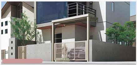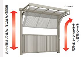 ●扉が柱に沿ってスライドする新構造の跳ね上げ式門扉です。 ●垂直に上下するため、開閉時に柱より前面に扉が飛び出さず、敷地を有効活用できます。●開口部から後ろに柱がないので、すっきりした納まりを実現します。