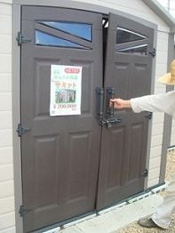 鍵をかけたケター物置の扉を