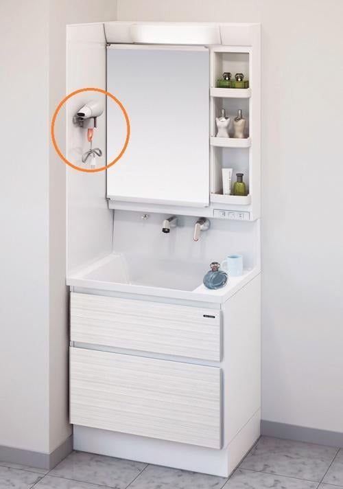 洗面周りの小物をくっつけて、機能的で便利な空間にできるんですよ