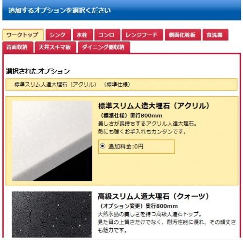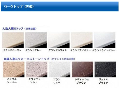 ワークトップはアクリル人造大理石トップ5色、高級人造石クォーツストーン5色計10色をご用意