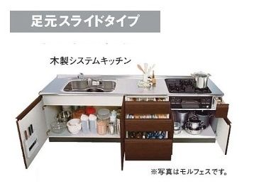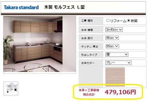 こちらの木製システムキッチン「モルフェス L型」工事費込みでこのお値段