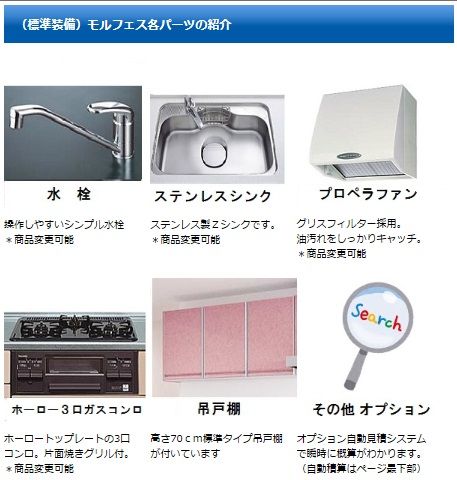 ファミリー庭園では以下のキッチンパーツを標準装備しております