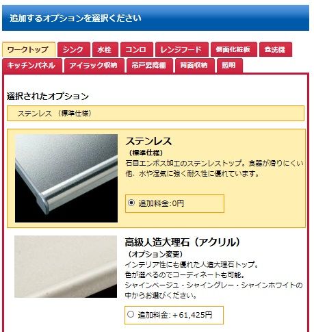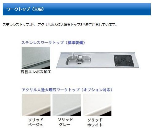 ワークトップはステンレス1色、人造大理石トップ3色をご用意