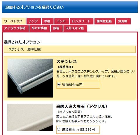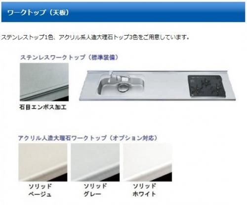 ワークトップはステンレス1色、アクリル人造大理石トップ3色