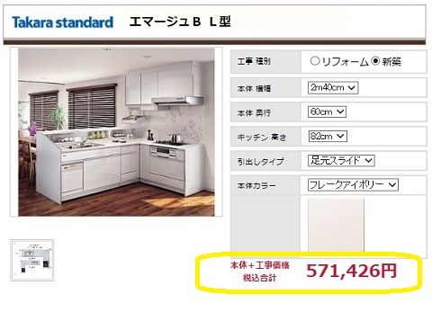 こちらのホーローシステムキッチン「エマージュ ベーシックカラー L型」が工事費込みでこのお値段