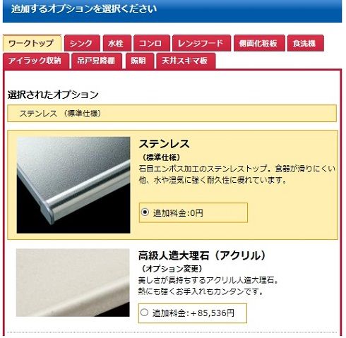 ワークトップはステンレス1色、アクリル人造大理石トップ3色をご用意
