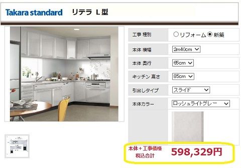 こちらのL型 ホーローシステムキッチン「リテラ」工事費込みでこのお値段
