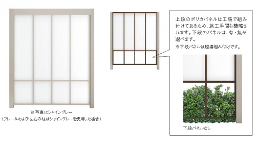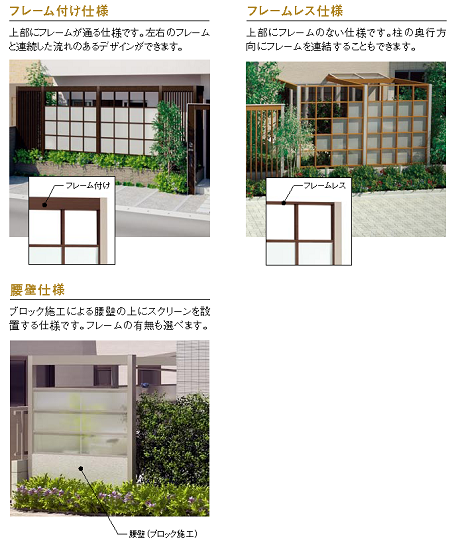 上部分のフレームの有無や、設置下部分をブロック腰壁にしたりなど