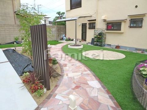 角柱前の植栽が効いてますね☆ 大きな面積を占める芝は人工芝なのでお手入れがラクなんですよ