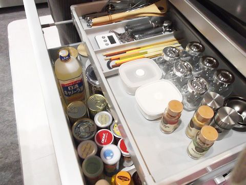 レードル類や調味料も上段のスライドトレーに収納できスッキリ!