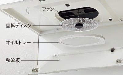 普段のお手入れとして、手前の整流板を拭き掃除したり、回収した油分を集めてくれる「オイルトレー」は