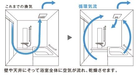 新商品は壁や天井にそって浴室全体に気流を循環させ、浴室全体を乾燥させてくれます。