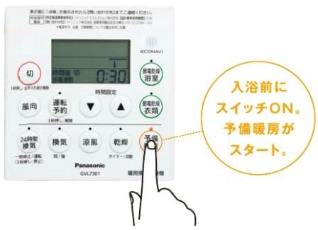入浴前にリモコンにある予備暖房をスイッチオン。
