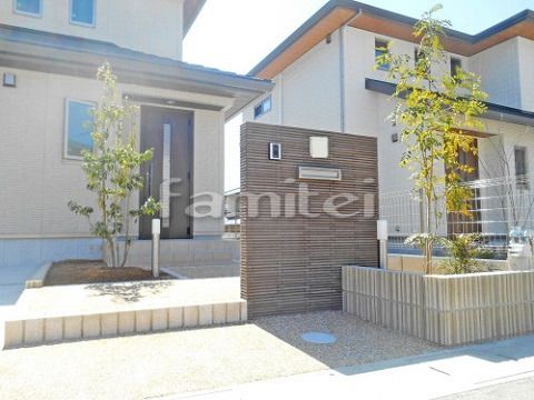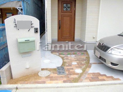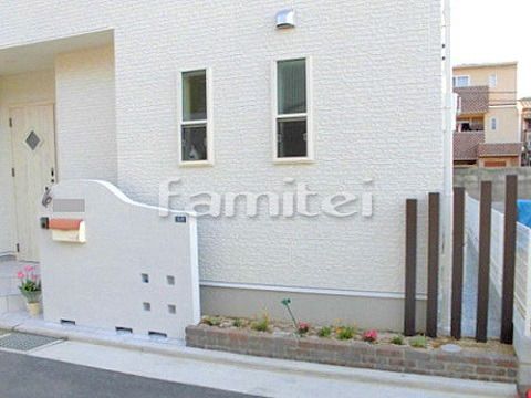 門柱、ポスト、アプローチがホワイトに統一された明るい印象の外構ですね