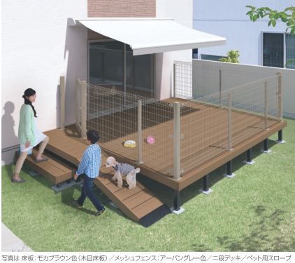 三協アルミのひとと木には、ウッドデッキにペット用のスロープが付けられます
