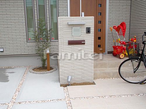 青いポストが外構のアクセントになっていますね