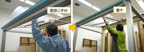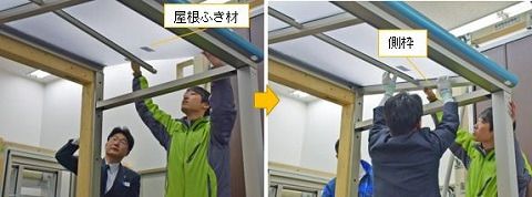 側枠→野縁→屋根ふき材→垂木→野縁→屋根ふき材→側枠の順に取付けていきます