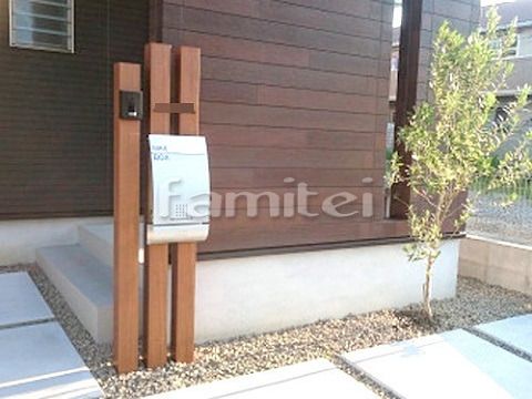 表札は道路に近いところに、ポストは玄関前に設置した利便性の良い外構です