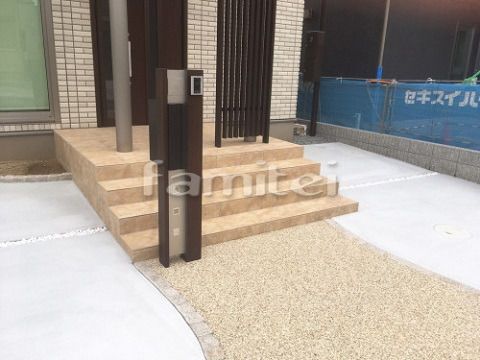 石貼りの門柱とアプローチで高級感のある外構に
