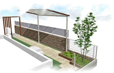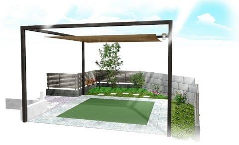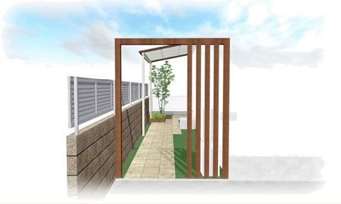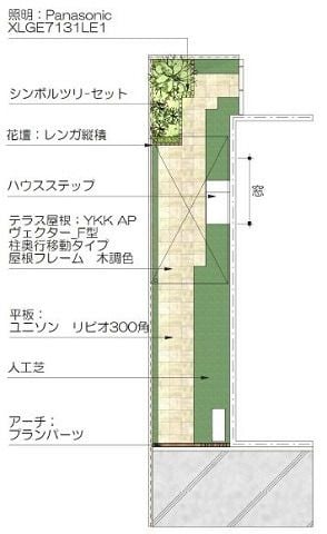 こちらは中央部分に人工芝を敷き、まわり(通路)に平板を敷いたプランです。