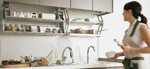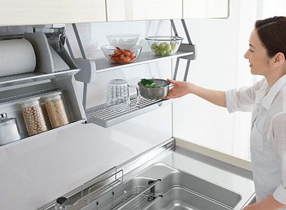 必要なときだけ、スッと下ろして使える2段の仮置き棚。調理スペースが広く使えます。