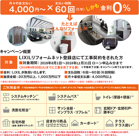 無金利ローンのキャンペーンは、リクシルの商品のみ・20万円以上が対象ですので、