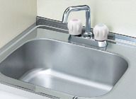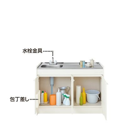 ゴミ収納器付排水トラップと、2ハンドル湯水混合水栓金具を標準装備