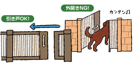 「開き門扉」は犬が取っ手に手をかけて解錠する恐れがあるため、