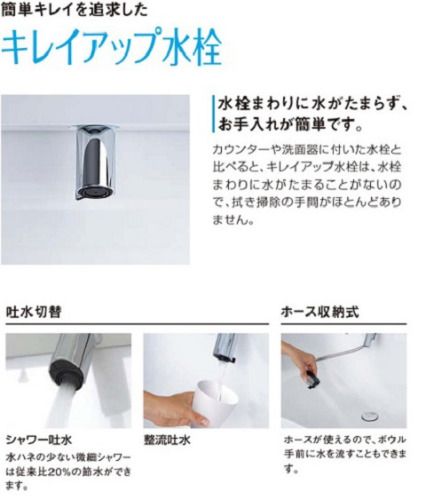 上から水が出るキレイアップ水栓は、水栓まわりに水がたまりにくいのでお掃除簡単