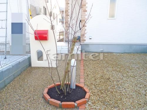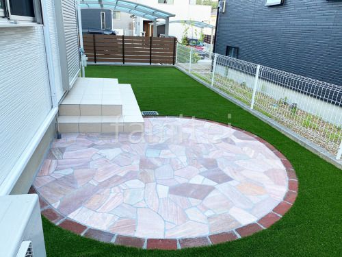 イエロー系の乱形石のアプローチにレンガでサークルデザイン