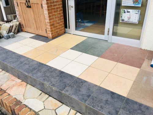 入り口には色様々なタイル・乱形石張り・レンガが貼られています