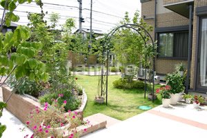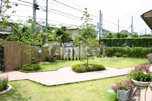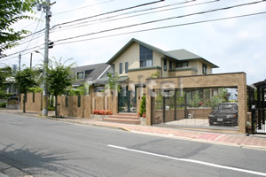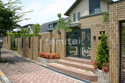 街並みに十分配慮した作品である。場所は古都奈良の郊外、閑静な住宅地の一角という。前面がインターロッキング舗装された側道となっている。二つのスリットを入れた板状のユニット塀を若干の高低をつけ、間にみかげピンコロによるグリーンベルトをセットし、バックにみかげ柱を建てるなど街並み緑化とリズム感湧出の努力が見られる。また、壁面仕上げの二丁掛けタイルのタテ使いと鋳物門扉(ラファール)+フィックスフェンスを使用していることで格調を高めており、端正なたたづまいとなっている。なお、ゲート脇の植栽マスのレッドリーフや小潅木が審査員たちの眼を引いたようだ。大事なポイントである。(猪狩達夫氏)