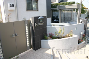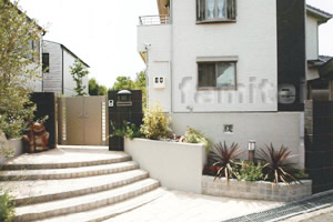 道路と接する境界線が「くの字」になった敷地に、見事に3台分の駐車スペースと門を配置しました。斜めに入る駐車場とエントランスの境界を湾曲した塀で仕切っているため、エントランスが広々としています。建物の黒いアクセントと門・塀まわりの黒の統一感、階段のやさしい印象のベージュなど、色彩の使い方も計算されています。