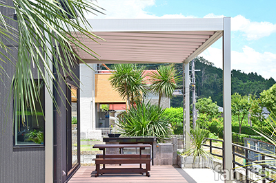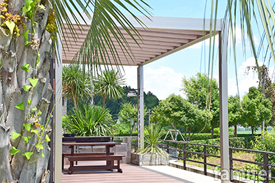 お庭をリゾートホテルのようなリラックスのできる空間にしたいとのご要望にプラン致しました。スタイリッシュなリレーリアテラスが高級感を演出し、植栽が落ち着きの非日常的な外部空間を作ってくれております。心地よい風を感じながら、アジアンリゾートの雰囲気を演出でき、とてもご満足いただけた作品となります。実に明るく気持ちの良いデッキスペースです。「リレーリア」の特性を活かしたコメントのコンセプト通り、楽しいアウトドアスペースの演出効果が表出されています。画像手前、近景に写り込んだ椰子のしな垂れる葉がリゾート感を醸し出しています。