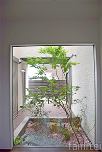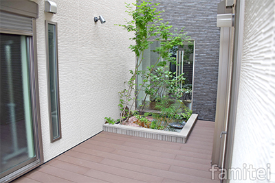 お施工主様ご自慢の中庭に、木の温かみが感じられるリウッドデッキをご提案し、ご希望通りの室内と一体感のあるデッキ空間が実現いたしました。お天気の良い日は、ウッドデッキにガーデンテーブルセットを出して、青空を感じながら、緑豊かな中庭を眺め、癒しの時間をお楽しみ頂いております。外から見えにくくプライバシーの保たれた中庭は、ご家族皆様の「楽しめるお庭」となり、大変ご満足頂ける作品となりました。リビングから開放的に広がる楽しそうな中庭デッキです。生活スペースに続く半外部のデッキテラスは、第二のリビングスペースとして多様な生活シーンをご家族に創出するでしょう。「リウッドデッキ200」の活用用途として、ぴったりのデッキ空間です。