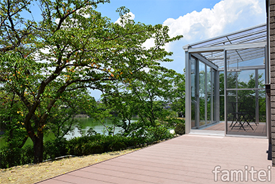 お庭の前に桜の木と池が広がる贅沢な景色を、有効に活用できるようにサニージュと樹ら楽ステージを採用しました。晴れの日はウッドデッキに腰をかけてのんびり。雨の日でもサンルームから景色を眺めることができます。365日思う存分景色を楽しめる素敵な空間になったと、とても喜んでいただいた作品となります。