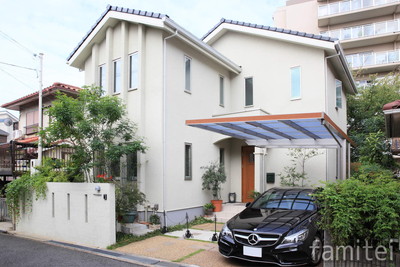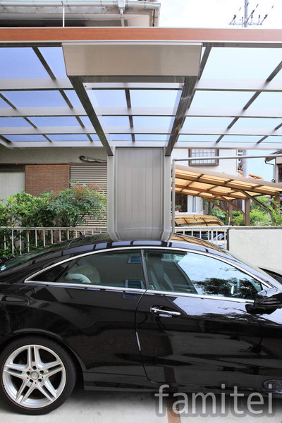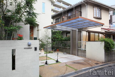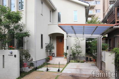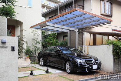 お施主様ご自慢の愛車にふさわしい最先端スタイルのマイポートneoをご提案しました。屋根枠の色も玄関ドアに合わせて、マロンブラウンをお選びいただくことで統一感ある仕上がりに。植栽いっぱいの外構ともマッチし、ご家族様から大変ご好評をいただきました。