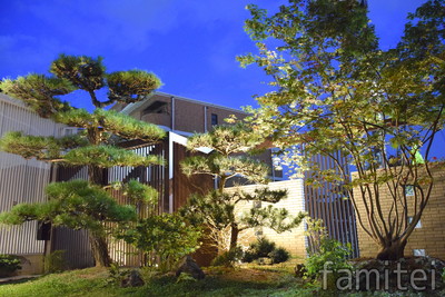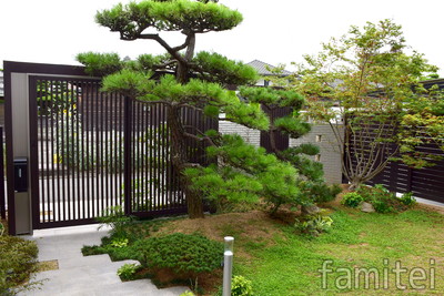 広い敷地全体を「プラスG」でデザインし開放感を保ちつつ、おしゃれに目隠しをし、重厚で高級感溢れるファサードとなりました。敷地を入ると立派な松が風情のある和風庭園を演出しており、「プラスG」の目隠しが道行く人の視線を緩やかに遮り居心地の良いプライベート空間が完成致しました。