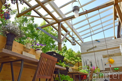 DIY好きの御夫婦が、限られた空間を上手にアレンジし、おしゃれで立派なテラスルームへとリノベーションされました。こちらの空間では、ご主人様手作りのブランコで遊んだり、宿題をされたりとお子様のお気に入りの場所となっています。休日にはお庭の緑やお花に癒されながら読書をされたりと、ご家族皆様で幅広くご活用頂いております。