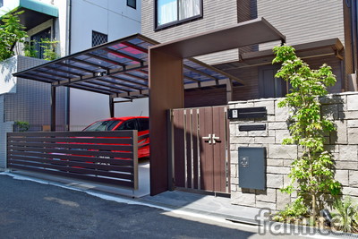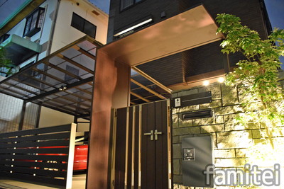 大胆な起伏でゴツゴツした岩肌が特徴の壁タイル門柱と、モダンな住宅と相性がいい「ジオーナ」門扉とのコンビネーションで迫力感とエレガントさが素敵に調和し存在感のある門まわりとなりました。又、門まわりの小さな屋根「Gルーフポイントルーフ」をエントランスの手前に設置し、嫌な雨の日も快適に郵便物をお受け取り頂くことができ、機能性も充実したファサードにお施工主さまに大変ご満足頂ける作品となりました。