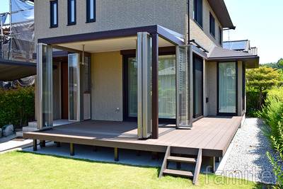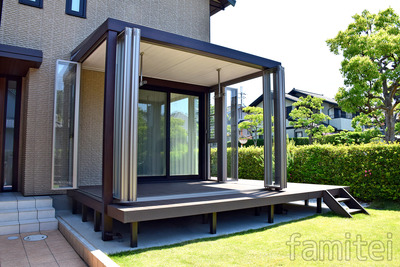 落ち着いた木目調のオーバードアと門扉で重厚感溢れる ファサードに仕上がりました。 お庭のガーデンルームも「ジーマ」の木製調で揃え、 リビングから続く新しい空間で、 晴れの日はフルオープンで光や風を感じながら開放感を味わい、 お天気の悪い日はお洗濯物を干したりと日々の生活にガーデンルームは 欠かせない存在になっております。 見た目も生活の質も向上し大変ご満足頂いております。